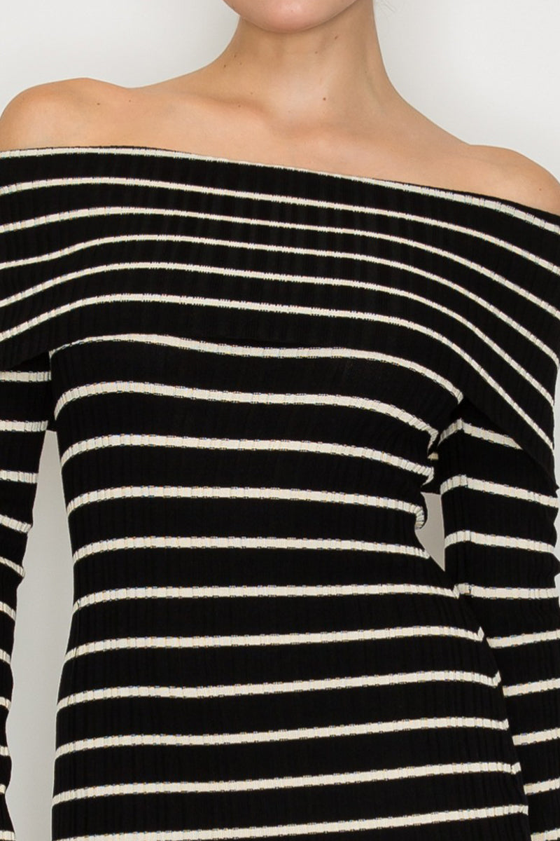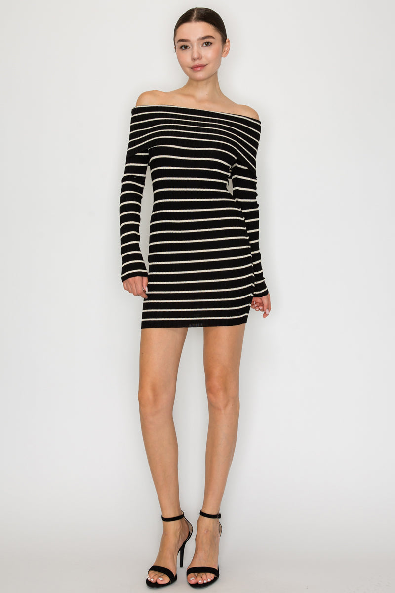 Vestido corto, manga larga, escote al hombro, rayas