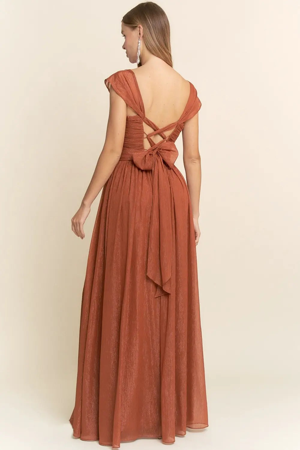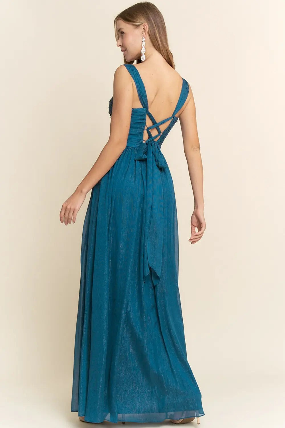 Vestido largo corte línea A, tirante grueso, argolla en pecho, liso